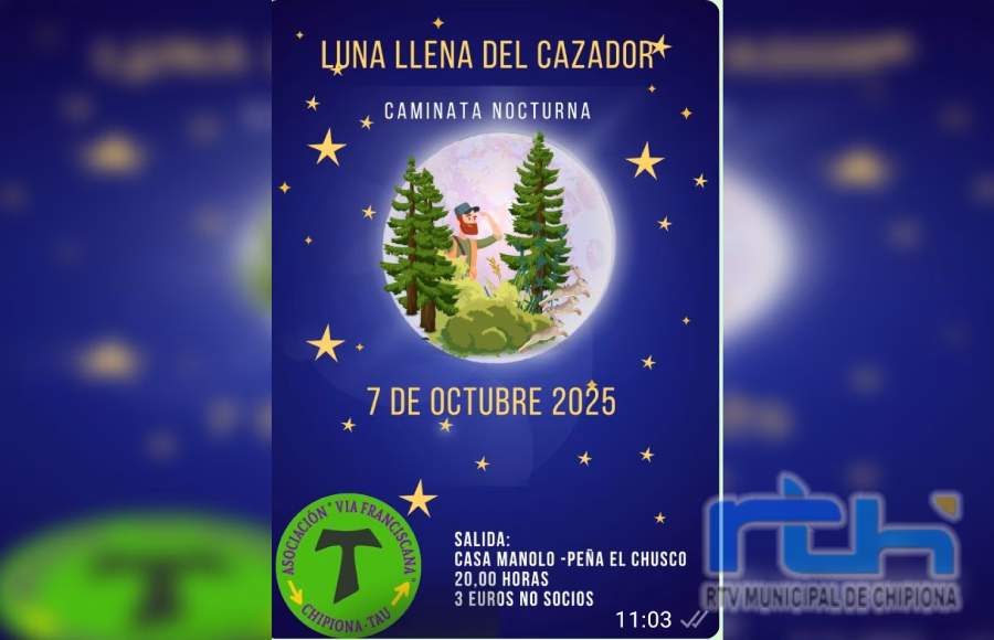 Hoy martes 7 de octubre el disco lunar se iluminará por completo. Coincidiendo con ello, la Asociación Vía Franciscana TAU de Chipiona ha organizado una nueva caminata nocturna, que ya es la décima y en esta ocasión se denomina ‘Luna llena del cazador’.