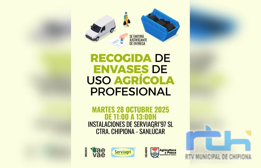 La Asociación española para la Valorización de Envases, con la colaboración de la Delegación de Agricultura del Ayuntamiento de Chipiona, ha programado una nueva recogida de envases de uso agrícola profesional en la localidad para el próximo martes, 28 de octubre, entre las 11:00 y las 13:00 h. Se desarrollará en las instalaciones de Serviagri’97 S.L., situadas en la carretera de Sanlúcar.