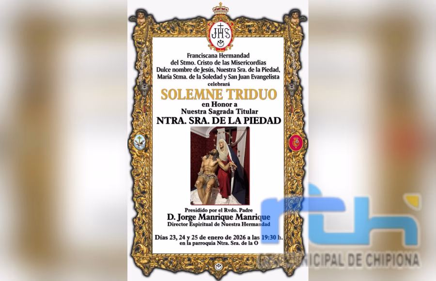 La actualidad cofrade nos lleva en Chipiona a la Franciscana Hermandad del Cristo de las Misericordias, que ha anunciado que la próxima semana celebrará un solemne triduo dedicado a Nuestra Señora de la Piedad como preparación para la Cuaresma y la Semana Santa.