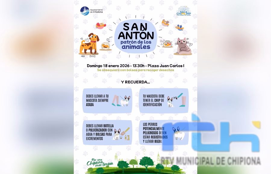 El alcalde de Chipiona, Luis Mario Aparcero, ha comunicado que Ayuntamiento de Chipiona, a través del Plan Integral de Limpieza (CHIPLIMP), desarrollará este próximo domingo 18 de enero una actividad de concienciación y cuidado del entorno tras la tradicional bendición de los animales con motivo de la festividad de San Antón, patrón de los animales y el acto de bendición que se llevará a cabo en la Plaza Juan Carlos I.