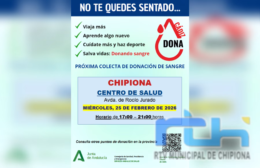 “No te quedes sentado… Cádiz dona. Viaja más, aprende algo nuevo, cuídate más y haz deporte, salva vidas donando sangre”. Este es el mensaje que lanza el Servicio Andaluz de Salud a través del Centro de Transfusión, Tejidos y Células de Cádiz en la campaña que tiene en vigor y con la que estará en Chipiona con una colecta mañana miércoles 25 de febrero, en concreto en el Centro de Salud Tolosa Latour de 17:00 a 21:00 h.