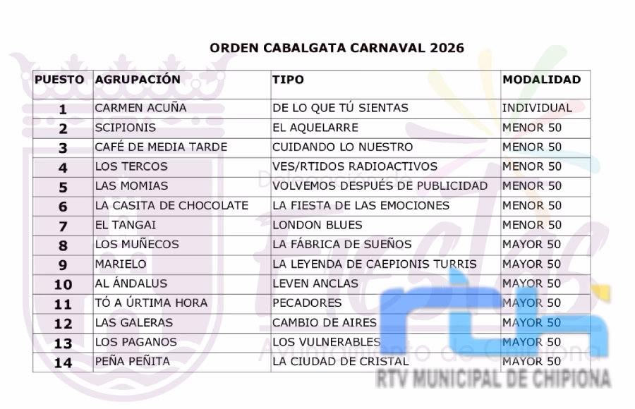 El concurso de la cabalgata del Carnaval de Chipiona 2026 contará con la participación de trece agrupaciones y un individual martes, 27 de enero de 2026martes, 27 de enero de 2026 Ver noticia